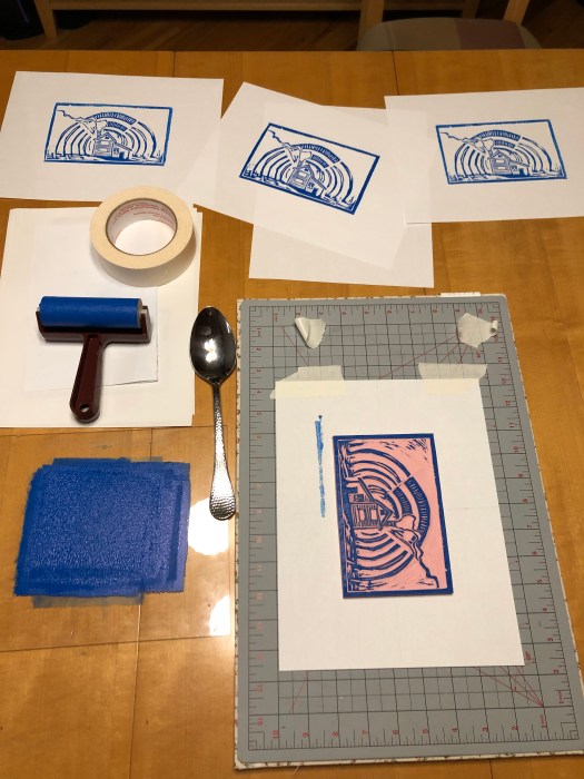 For the class, linocut kits were available to purchase from the UM Bookstore that included almost everthing needed—the easy cut lino blocks, rice paper, water-soluble block printing inks and few tools. I already had most of these items from various workshops and printing classes I’ve taken over the years, so only had to buy or scrounge up a few things.