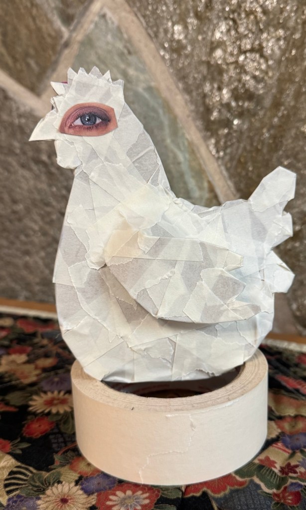 Today’s adventure: I’m having a play ‘hatching’ some little French hen sculptures using up-cycled food packaging trash, bits and bobs, and paper mâché, decoupage\collage. I intend to make a small flock of a dozen or so–as well as upscale them to a life size version– so lots of experiments in the works!